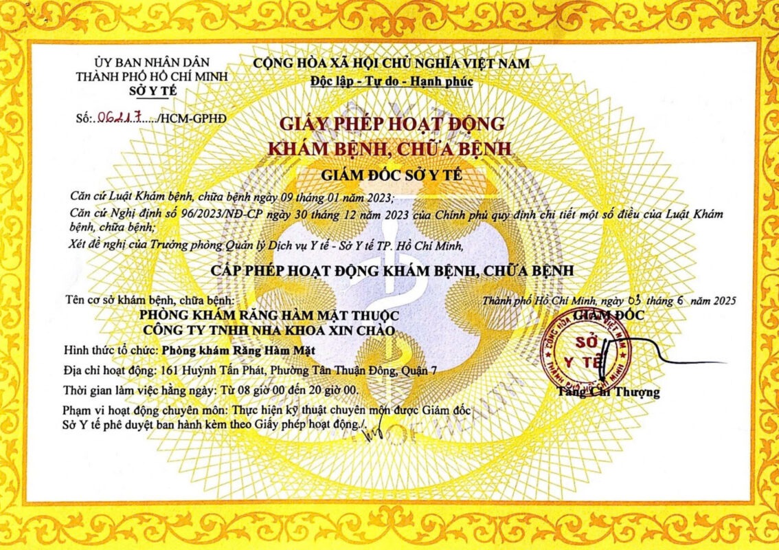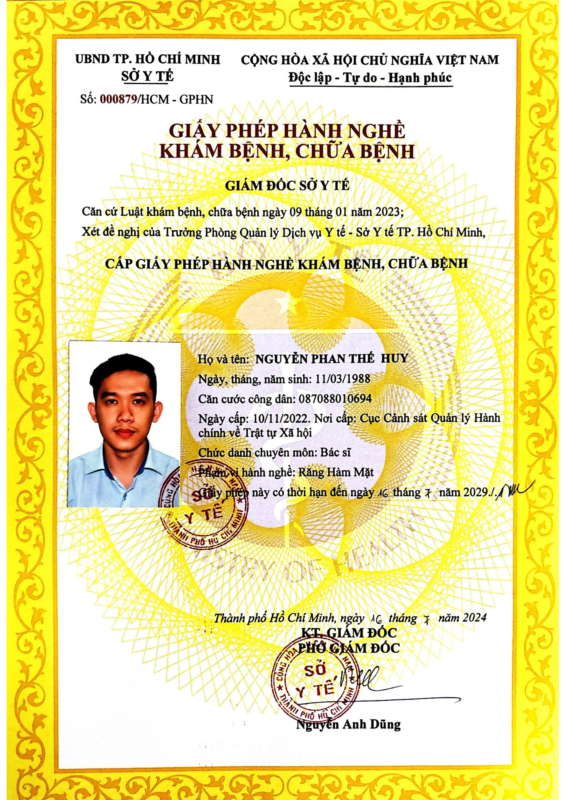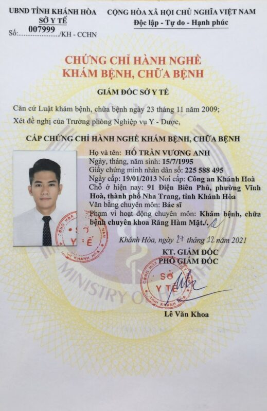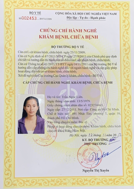 - Chứng chỉ Phẫu thuật miệng do Bệnh viện Răng Hàm Mặt Trung Ương TP.HCM cấp.