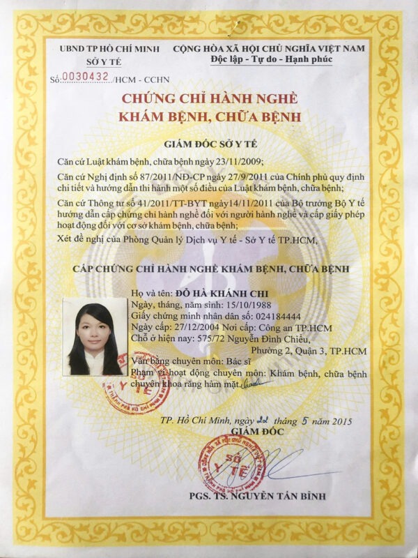 - Chứng chỉ Chỉnh Nha, Đại học Y Dược TP.HCM.